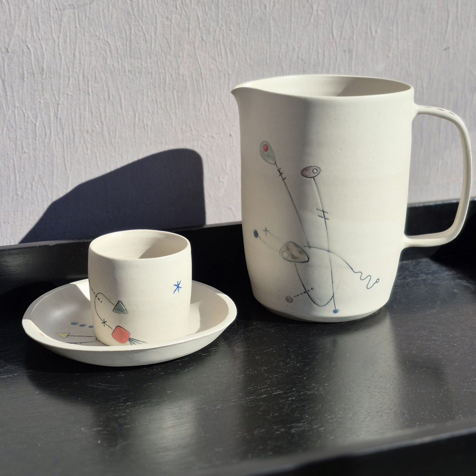 Pichet en grès blanc émaillé, décoré à la main aux engobes dans l’esprit graphique « Géometrik ».